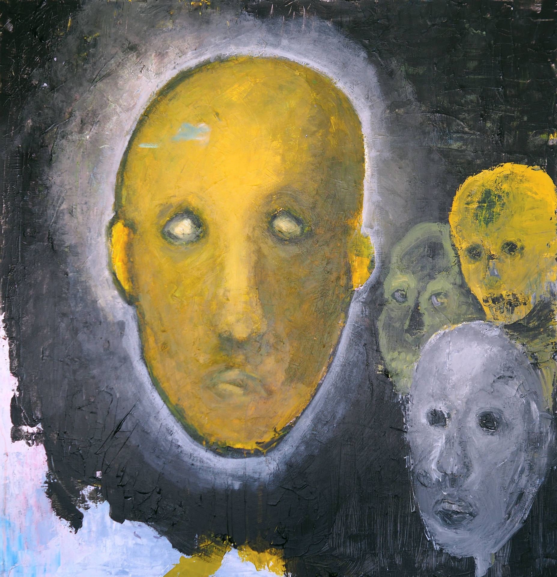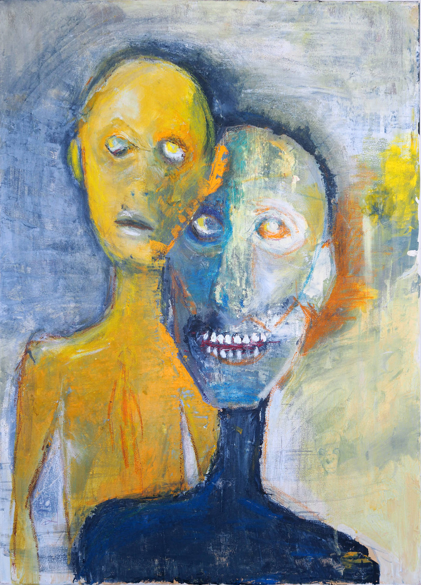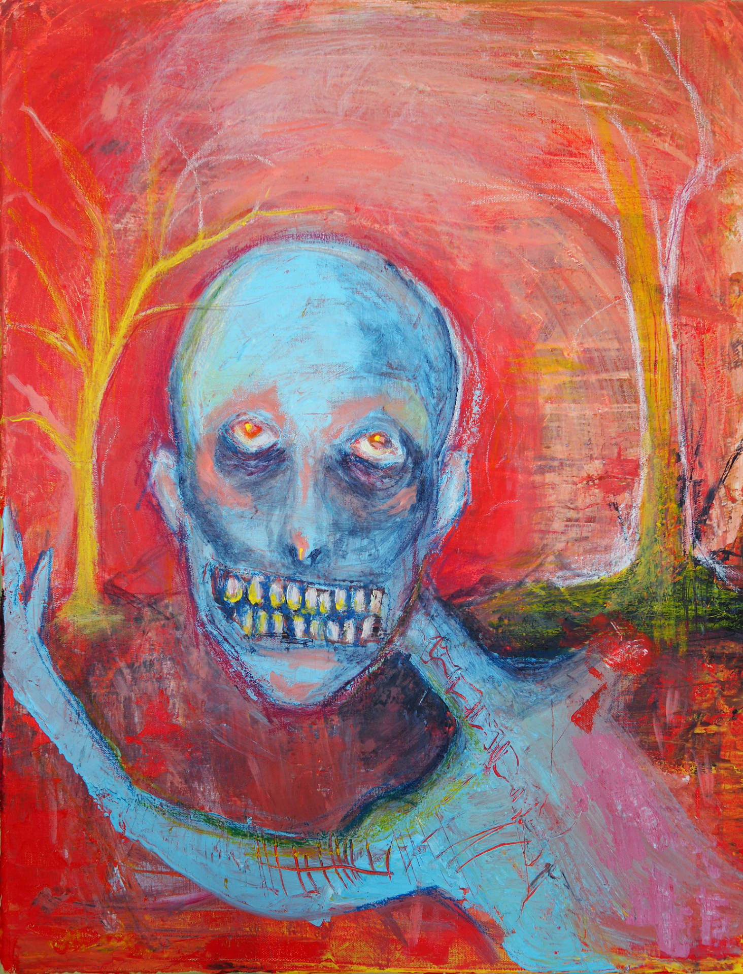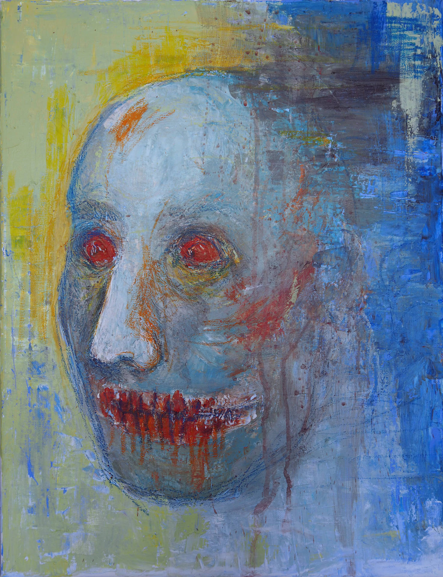 This painting is an expressive portrait in bright, contrasting colors. The central figure is the face, painted mostly in shades of blue and dark tones, with noticeable brushstrokes and texture. The character's eyes are light, almost white or with a slight reddish tint, which creates the impression of glassiness or strong internal tension. The mouth is also highlighted in red, which contrasts with the blue face.